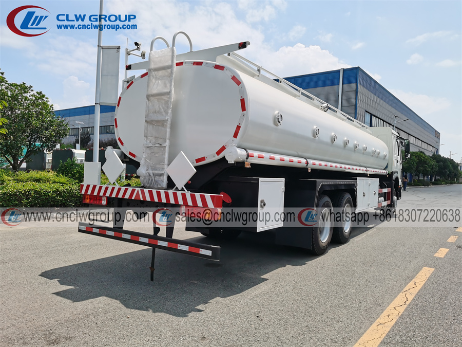 HOWO 6x4 20 to 25 m3 diesel tanker oil fuel transport tank trucks, 23000 liters volume, carbon steel tank body, tank internal divided into 9 compartments, with 9 pcs level gauges, with 9 pcs manhole cover with high manhole cover, 9 pcs bottom safety valves, 1 pcs gravity discharge ports with 9 valves, with 1 pcs safety valve foot valve; with optional to install flow meter to monitor the fuel flow amount, with 80-60 fue pump, pump-inlet and pump-outlet function; with 2 pcs fuel hose, 2 pcs hose box, valve box, tool box, ladder, top anti-skid walkway, top protective fence, rear bumper, fire extinguishers, dangerous warning stickers, reflective stickers, etc.
