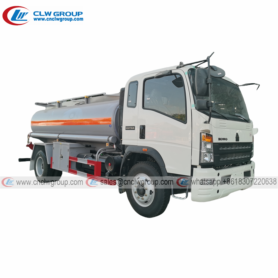 HOWO 8000 liters diesel transfer tank refuel tanker truck, 8000 liters volume, carbon steel tank body, 1 set of level gauges, with 1 pcs manhole cover with high manhole cover, 1 sub-tank valves, 1 pcs gravity discharge ports, with 1 pcs safety valve foot valve; with optional to install flow meter to monitor the fuel flow amount, with 60/30 fue pump, pump-inlet and pump-outlet function; with 2 pcs fuel hose, 2 pcs hose box, valve box, tool box, ladder, top anti-skid walkway, top protective fence, rear bumper, fire extinguishers, dangerous warning stickers, reflective stickers, etc.